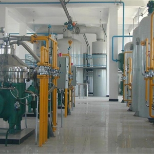 操作條件:過濾毛油含雜不大于0.2%,堿液濃度18~22°Bé,超量堿添加量為理論堿量的10%~25%,有時(shí)還先添加油量的0.05%~0.20%的磷酸(濃度為85%),脫皂溫度70~82℃,洗滌溫度95℃左右,軟水添加量為油量的10%~20%。連續(xù)真空干燥脫水,溫度90~95℃,操作絕對(duì)壓力為 2.5~ 4.0 kPa。吸附脫色溫度為105~100℃,操作絕對(duì)壓力為 2.5~ 4.0 kPa,脫色溫度下的操作時(shí)間為30 min左右,活性白土添加量為油量的 1%~4%。利用立式葉片過濾機(jī)分離白土?xí)r的過濾溫度不低于100℃。脫色油中P≤5 ppm、Fe≤0.1ppm、Cu≤0.01ppm。脫臭溫度240~260℃左右,操作絕對(duì)壓力260~650Pa,汽提蒸汽通入量油量的0.5%~2%,脫臭時(shí)間 40~120min,檸檬酸(濃度 5%)添加量為油量的0.02%~0.04%,安全過濾溫度不高于70℃。