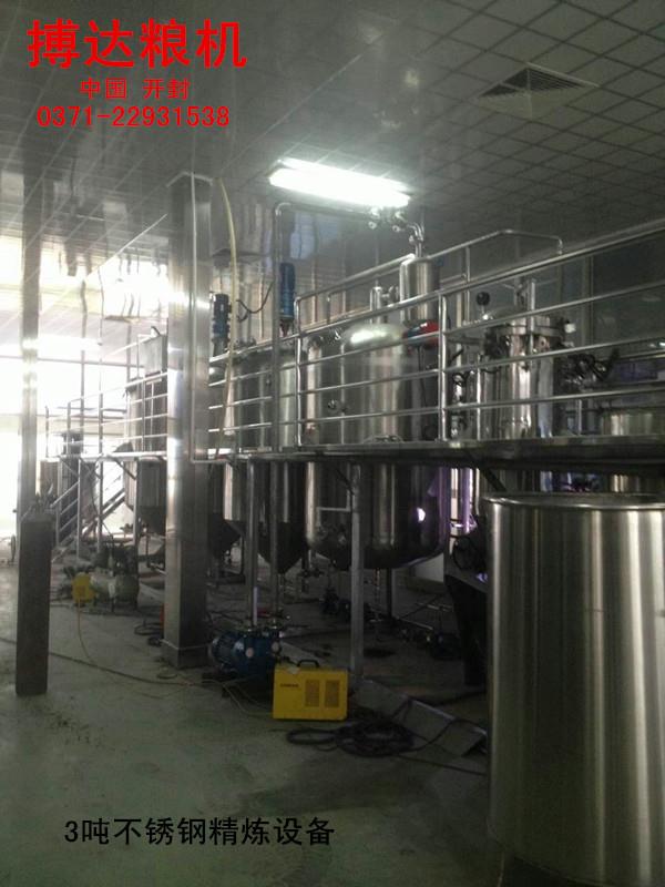 大豆油精煉設(shè)備熱脫皮工藝,今年來(lái),大豆油熱脫皮工藝得到較快的發(fā)展和推廣,大豆油熱脫皮紅衣的形式很多,經(jīng)過(guò)處理后的大豆直接進(jìn)入流化床加熱干燥,使表面溫度達(dá)到75-92攝氏度,大豆所含水分9%左右,這主要是為了加熱大豆皮和表層,皮松脆易于裂開(kāi)。然后由輥破碎機(jī)將大豆對(duì)半破開(kāi)分為兩瓣,并落入撞擊機(jī)利用撞擊機(jī)作用使豆皮從仁粒上松脫下來(lái),經(jīng)吸風(fēng)分離器進(jìn)行脫皮分離,經(jīng)部分脫皮的半粒狀大豆再經(jīng)過(guò)齒輥破碎機(jī)破碎成符合軋坯要求的粒度,而后又經(jīng)撞擊機(jī)和多級(jí)撞擊和多級(jí)吸風(fēng)分離器進(jìn)行第二次脫皮分離,分離出的豆仁至下道工序,豆皮收集后送至豆皮倉(cāng)庫(kù),該工藝與冷脫皮工藝相比周期短,短時(shí)間的高溫處理減少了大豆油中油脂的變質(zhì)和蛋白質(zhì)的變性。熱大豆破碎后的粉末度減小,這將更有利于皮仁的分離,減少皮中的含仁量。經(jīng)脫皮后的熱豆粒可直接進(jìn)行軋坯,或?yàn)榧訜彳浕笤偃ボ埮?,這將大大降低生產(chǎn)過(guò)程中的蒸汽消耗。